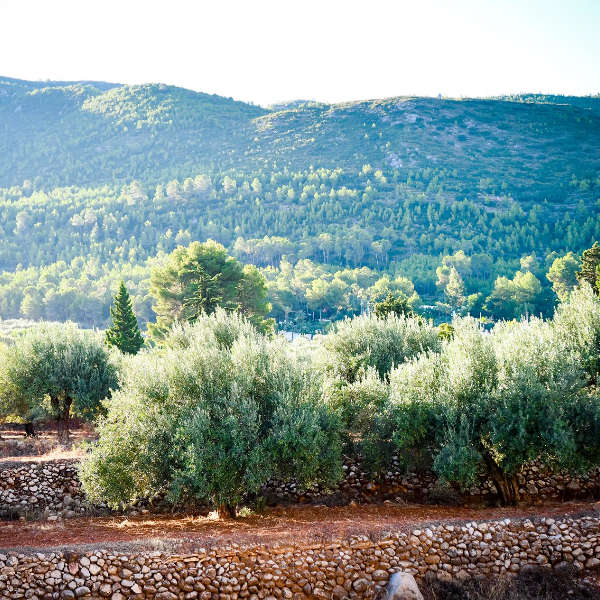 Oliveres que creixen a més de 350 m. d’altitud sobre el nivell de la mar, molt a prop del Mediterrani, i doten a l’oli d’un gran temperament.